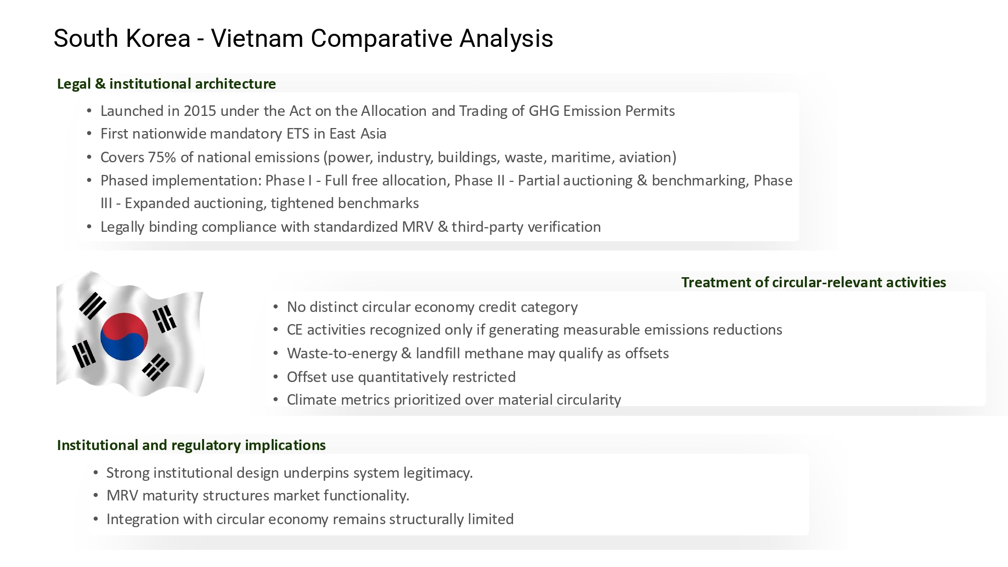 South Korea implemented the Korea Emissions Trading Scheme (K-ETS) in 2015 under the Act on the Allocation and Trading of Greenhouse Gas Emission Allowances, making it the first mandatory nationwide ETS in East Asia. The system covers about 75% of total national emissions, including the power, industrial, building, waste, maritime, and aviation sectors. K-ETS was implemented in phases, starting with a fully free allocation in the initial stage, transitioning to partial auctioning and benchmark allocation in the next stage, and then expanding auctioning and tightening allocation standards in subsequent stages. Legally, compliance obligations are binding, accompanied by a standardized MRV system and a third-party verification mechanism. However, South Korea has not established a separate credit category for the circular economy; circular activities are only recognized when they generate measurable emission reductions, such as converting waste to energy or capturing methane from landfills. This suggests that K-ETS has a strong institutional foundation and is operating quite effectively, but its integration with the circular economy remains structurally limited.