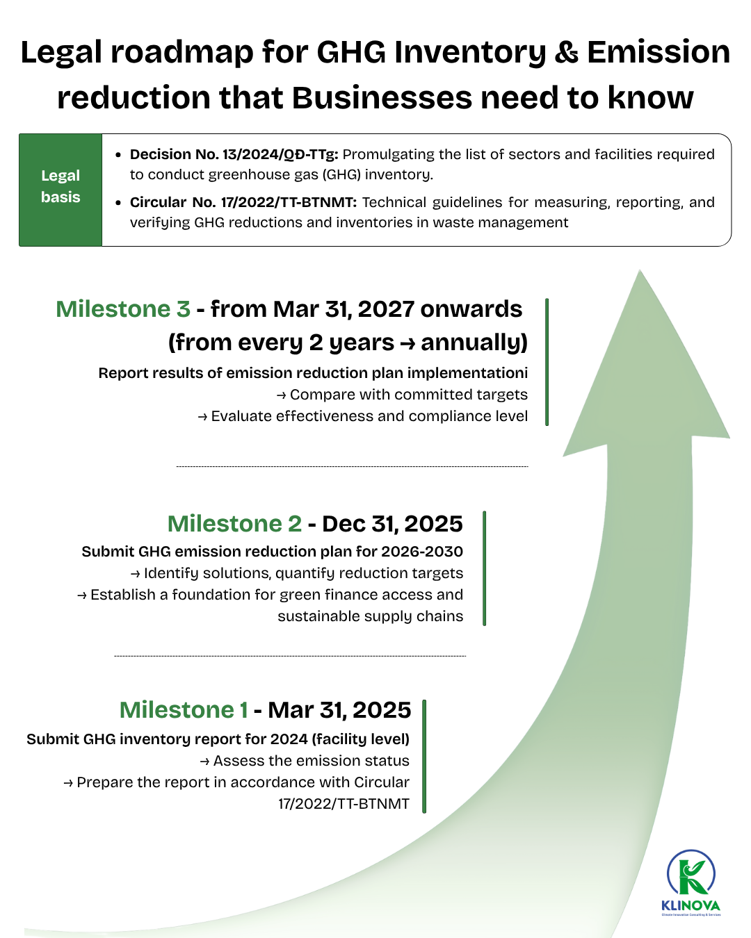 To fulfill this requirement, enterprises need to analyze data from the Milestone 1 inventory to identify major emission sources, while also engaging relevant departments (communications, finance, operations, etc.) to develop a cohesive plan. Delays in preparing the mitigation plan may lead to missed opportunities such as access to green credit, participation in energy transition programs, or alignment with sustainable supply chains promoted by the Government.
