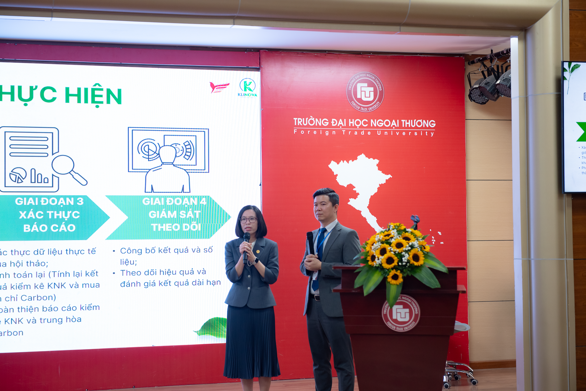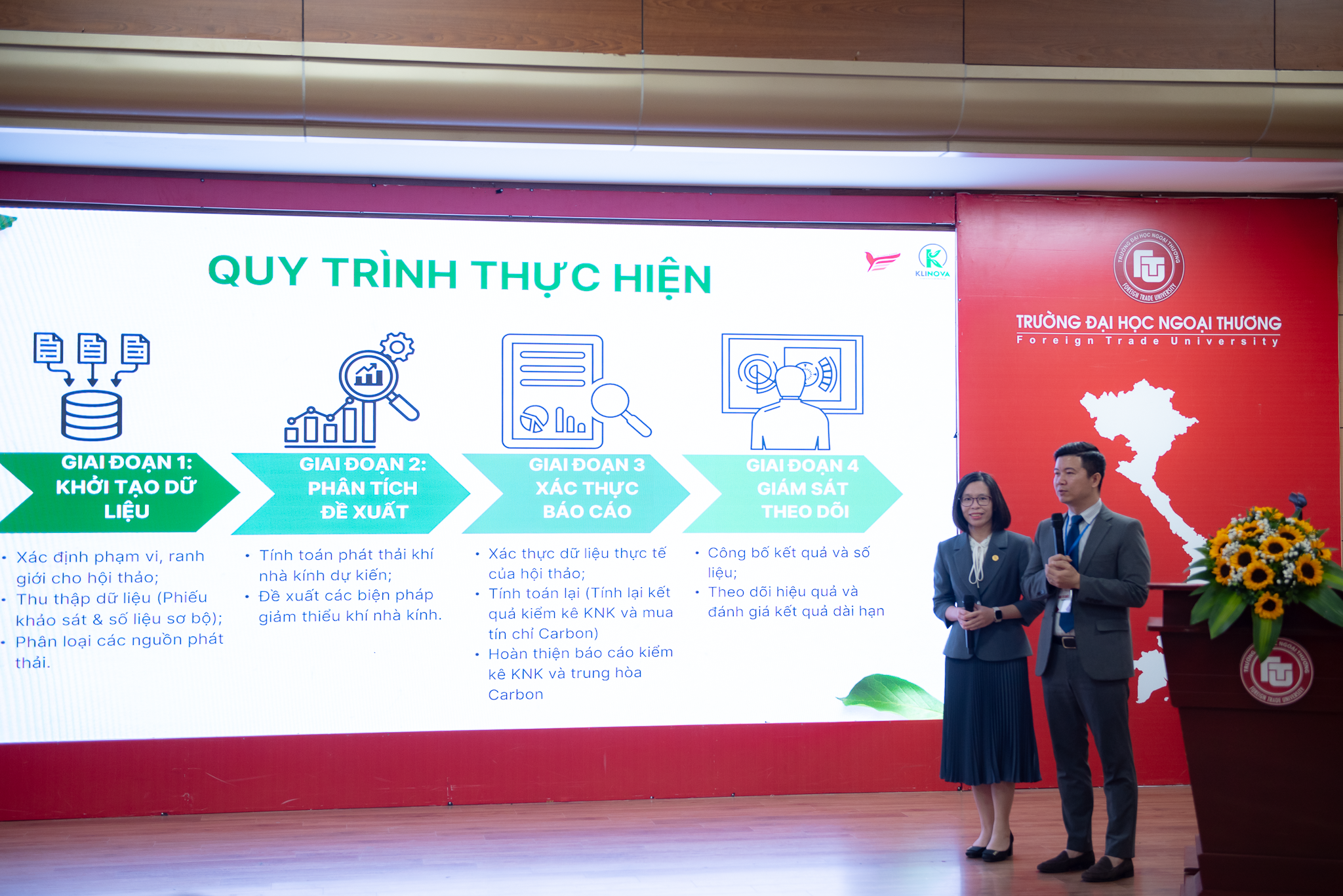 During the conference, experts from KLINOVA shared detailed information on how KLINOVA could accompany the conference in its goal of moving towards carbon neutrality. Ms. Nguyen Thi Minh Hue, KLINOVA's Project Director, and Mr. Nguyen Ngoc Ha, Director of the Institute for Innovation Research at Foreign Trade University, presented the content on the greenhouse gas inventory model for the event, which included four main stages introduced to the audience.