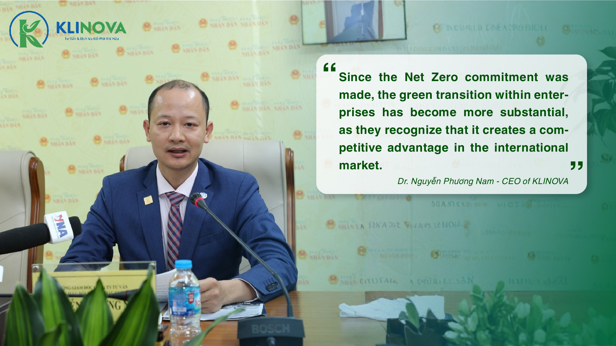 Attending the event as a representative of the business community, Dr. Nguyễn Phương Nam, CEO of KLINOVA, highlighted: “Since the Net Zero commitment was made, the green transition within enterprises has become more substantial, as they recognize that it creates a competitive advantage in the international market.” His remarks not only served as a reminder of environmental responsibility but also as a strategic warning to businesses: those that fail to take the initiative risk being left behind in global supply chains.