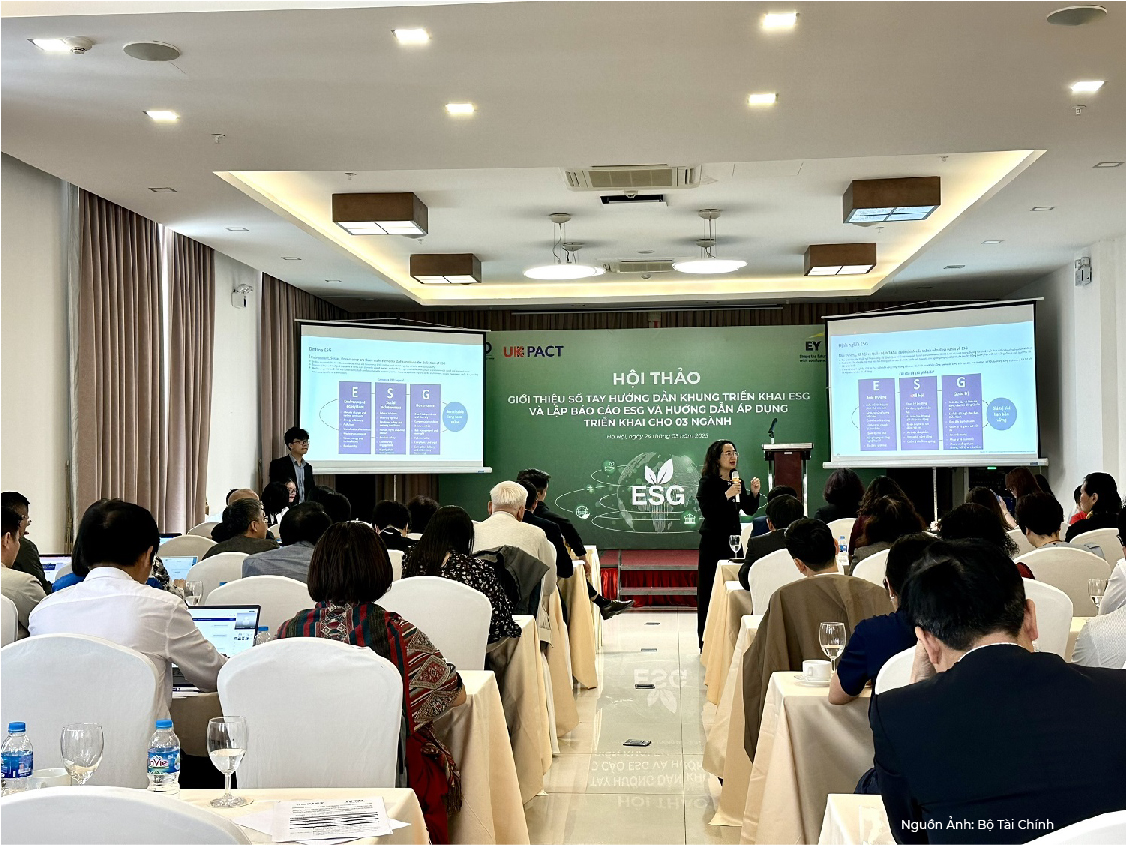 Ngày 24/3 vừa qua, hội thảo giới thiệu “Sổ tay hướng dẫn khung triển khai ESG, Lập báo cáo ESG và Hướng dẫn áp dụng cho ba ngành” đã được tổ chức tại Hà Nội.Sự kiện do Cục Phát triển doanh nghiệp tư nhân và Kinh tế tập thể (Bộ Tài chính) phối hợp cùng Đại sứ quán Anh, Tổng Lãnh sự quán Anh, các đơn vị tư vấn gồm Quỹ Châu Á Việt Nam, và Công ty TNHH Ernst & Young Việt Nam (EY Việt Nam) thực hiện, nhằm hỗ trợ doanh nghiệp Việt Nam trên hành trình phát triển bền vững và hội nhập quốc tế. Sự kiện nằm trong khuôn khổ Chương trình Phi dự án "Thúc đẩy tài chính xanh thông qua cải thiện hoạt động công bố thông tin ESG của các doanh nghiệp tại Việt Nam, với trọng tâm thông tin rủi ro tài chính liên quan đến khí hậu" do Cục Phát triển Doanh nghiệp tư nhân và Kinh tế tập thể.