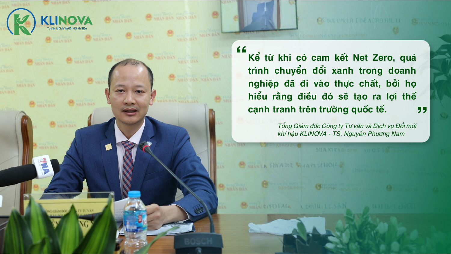 Có mặt tại sự kiện với vai trò đại diện các doanh nghiệp, TS. Nguyễn Phương Nam - Tổng Giám đốc KLINOVA. Ông Nam nhấn mạnh: “Kể từ khi có cam kết Net Zero, quá trình chuyển đổi xanh trong doanh nghiệp đã đi vào thực chất, bởi họ hiểu rằng điều đó sẽ tạo ra lợi thế cạnh tranh trên trường quốc tế.” Đây không chỉ là lời nhắc về trách nhiệm môi trường, mà còn là cảnh báo chiến lược cho doanh nghiệp: nếu không chủ động, sẽ bị bỏ lại phía sau trong chuỗi cung ứng toàn cầu.
